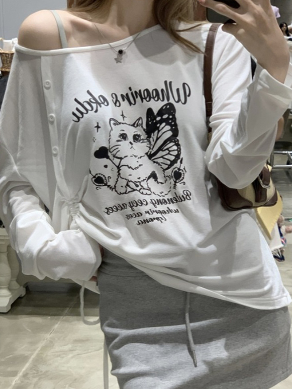 Schulterfreies Oversized-Langarm-T-Shirt mit Katzen-Print
