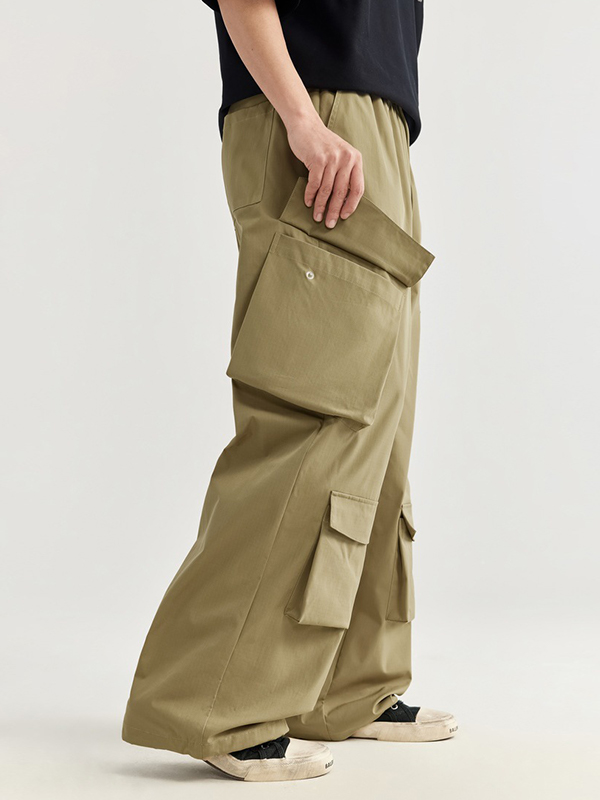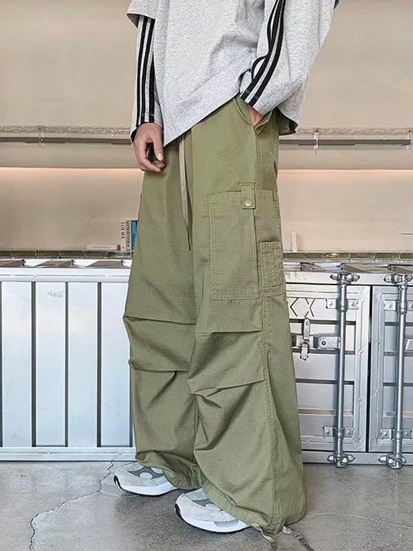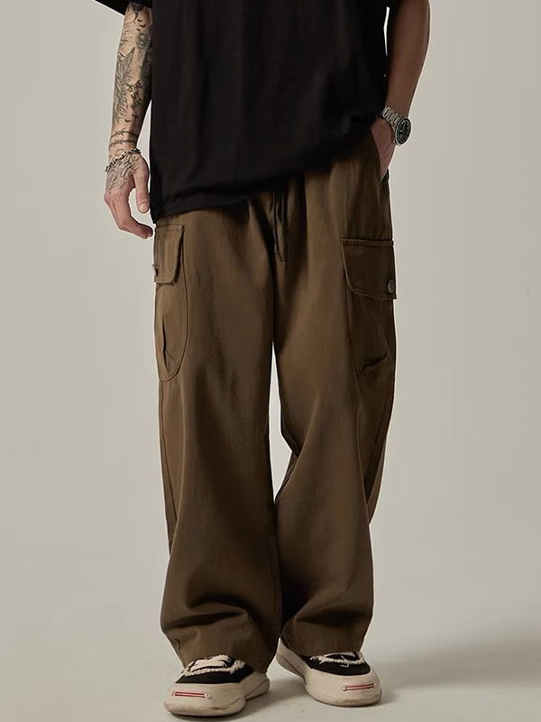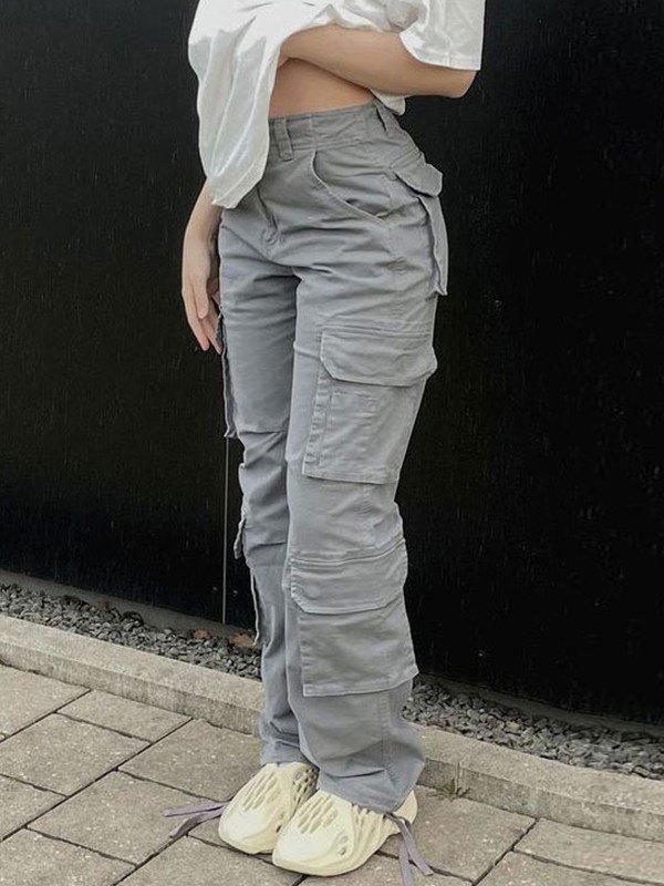 Lässige Streetwear-Arbeitshose mit hoher Taille, mehreren Taschen, Kordelzug, lockerer Passform und geradem Bein