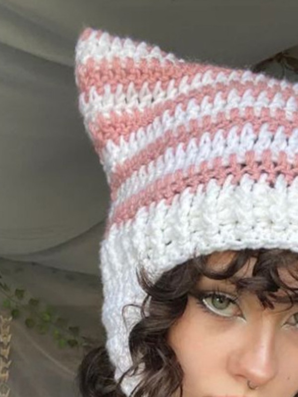 Handgefertigte Strickmütze mit Katzenohrstreifen