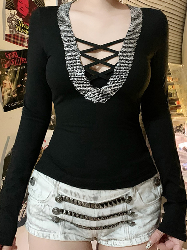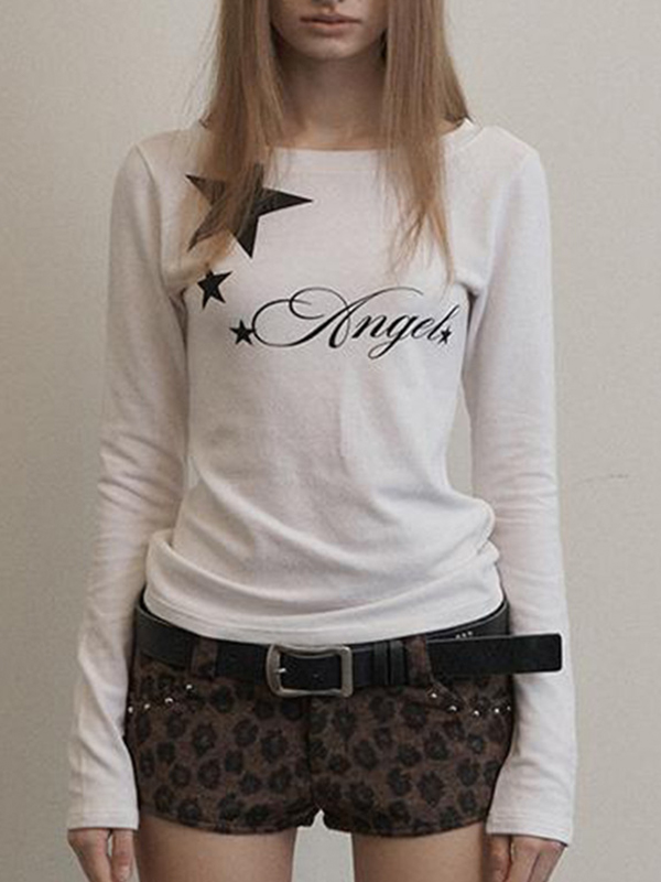 Schulterfreies, langärmliges T-Shirt mit Cartoon-Strass-Print und Spitzenbesatz