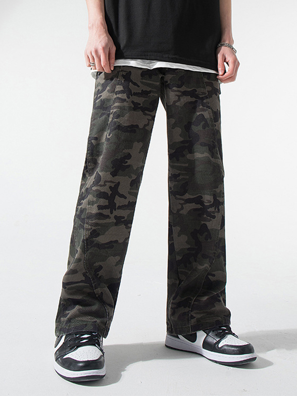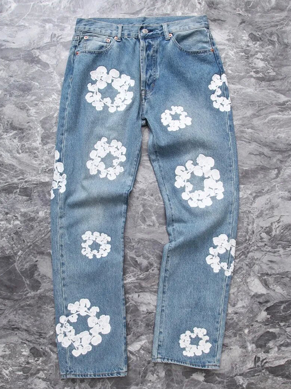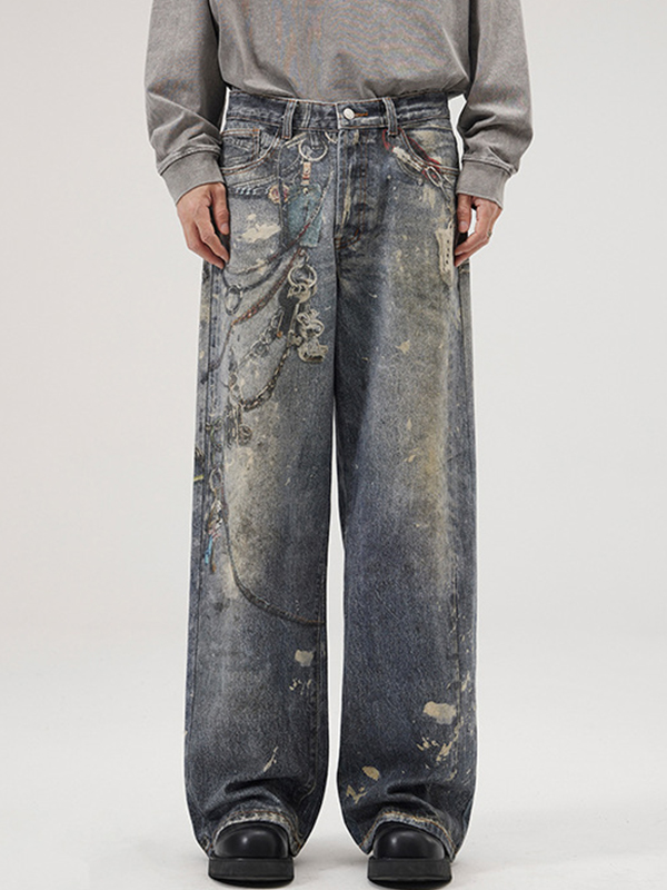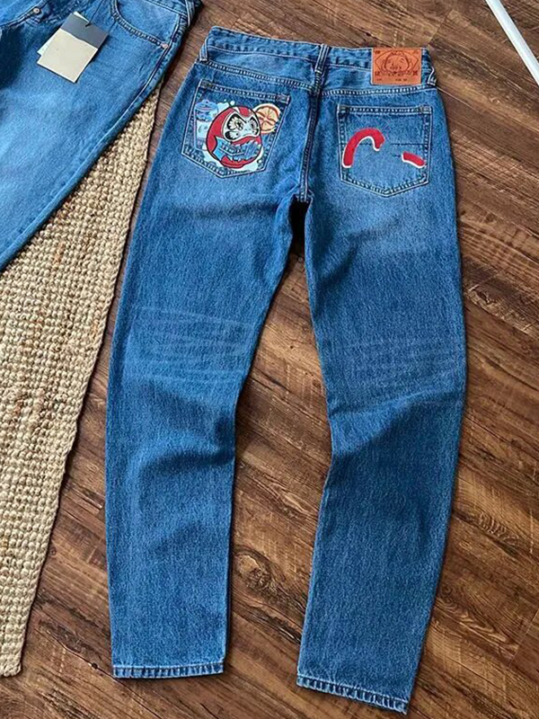 Lose Herrenjeans mit mehreren Taschen und buntem Aufdruck
