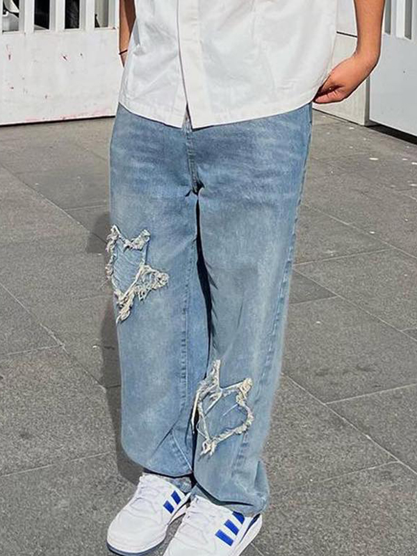 Lochiges Katzenschnurrhaar-Design, das den Boden wischt, zerrissene Jeans
