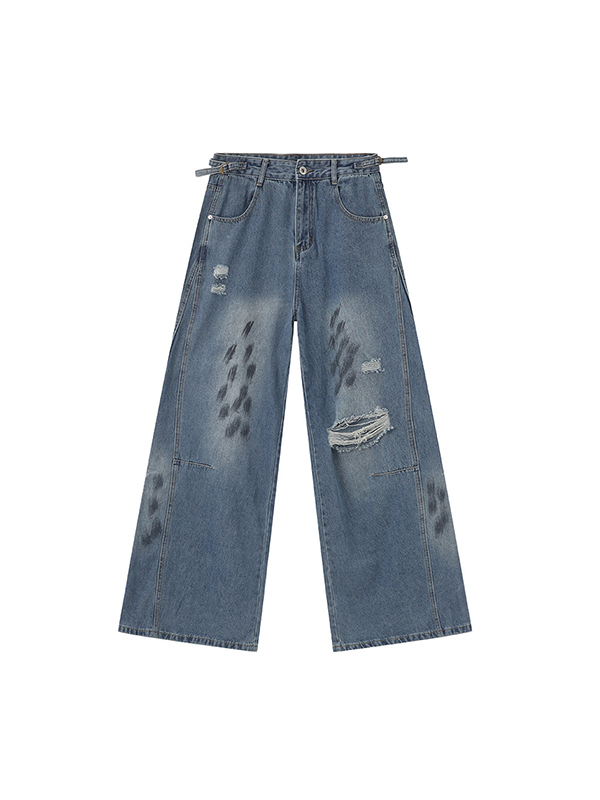 Lochiges Katzenschnurrhaar-Design, das den Boden wischt, zerrissene Jeans