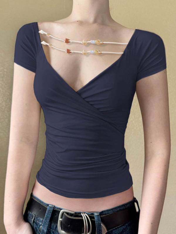 Kurzärmliges T-Shirt mit Perlen und Kordelzug