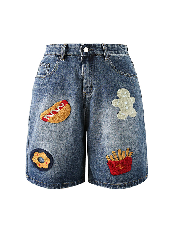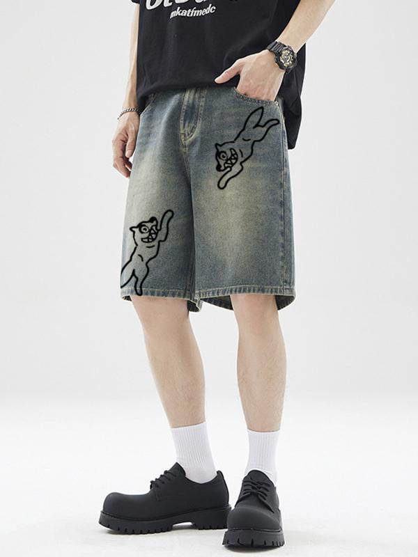 Gerade, lockere Denim-Shorts für Herren mit Distressed-Stickerei