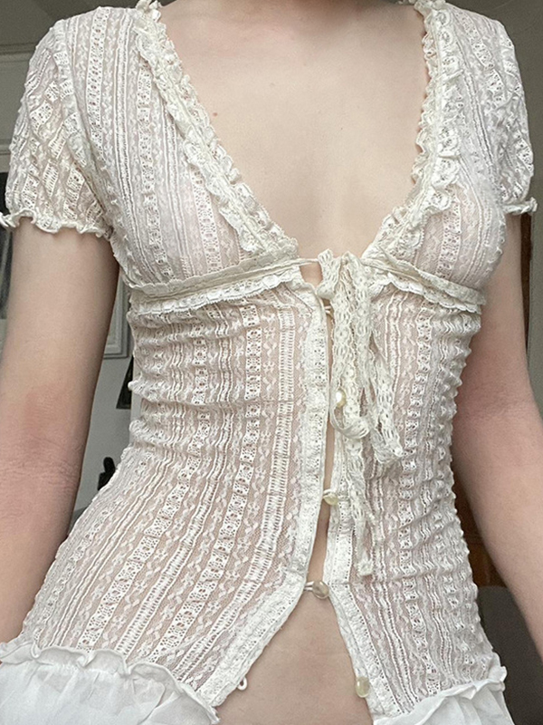 Kurzärmliges T-Shirt mit Spitzen-Ballonärmeln